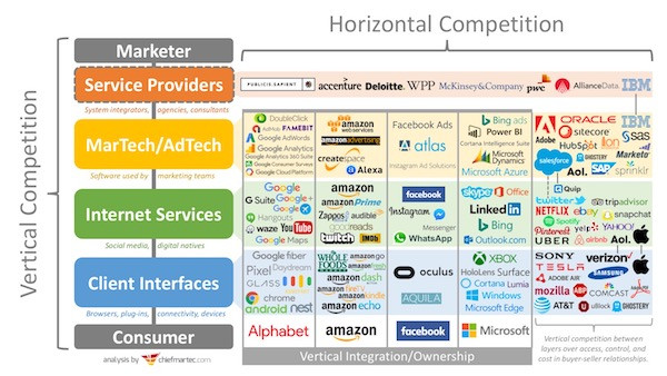 垂直竞争中最强大的“竞争对手”是那些拥有独家用户的公司。如果你想通过他们的渠道或触点触达用户,你必须同意他们的条款,或放弃使用。 我认为垂直竞争是当今商业中最具破坏性的力量之一,部分原因是公司不太可能察觉到垂直竞争对手。我们可以很容易看到甲骨文(Oracle)和Salesforce在martech领域中互为竞争对手(他们是水平竞争者,在渠道的同一阶段互相竞争)。但将Facebook、亚马逊或Verizon视为甲骨文和Salesforce在martech领域的竞争对手却显得不那么容易,但从垂直竞争的大背景来看,它们确实如此。 有关数字渠道动态垂直竞争动态的大规模示例,我们可以参考腾讯、阿里巴巴和百度在中国互联网市场上的不可思议的力量。他们控制着该市场绝大多数消费者的入口和数据,想要以数字化方式接触这些用户的营销人员必须通过他们的营销解决方案(如阿里巴巴的Uni Marketing或腾讯的整合营销服务)来实现。