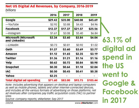最常见的例子是谷歌和Facebook在数字广告方面的垄断。在美国,几乎63.1%的广告费用都投向了这两家公司,以及他们的兄弟网站,如YouTube和Instagram。