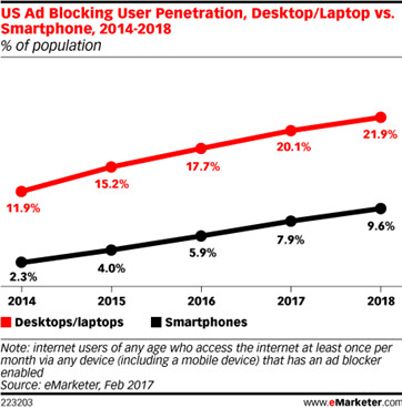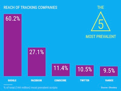 他们的力量不可比拟,因为没有什么替代品可以绕过他们直接触及到观众。如果您对Google的搜索广告价格和政策不满意,您打算怎么办?难道将搜索费用移至Bing吗? 对Facebook和Instagram来说一样。 Snap和Pinterest可能是竞争对手,但它们并不能成为替代者。 这就是为什么尽管面临着来自宝洁等主流广告商在度量及可见性问题上的强大阻力,Google和Facebook仍能够坚守着自己的统治地位。第三方广告技术供应商对于这种现象也无法提供太多帮助,因为他们没有足够的力量强行打破Facebook或Google的围墙。 而Facebook和谷歌的力量更是延伸到了他们的围墙之外,他们非常成功地让独立网站安装他们的“跟踪”脚本——无论是Google Analytics还是Facebook Connect。 由Ghostery进行的最新的“跟踪跟踪者(Trackingthe Trackers)研究”发现,在所能找到的网页中,有近50%的网页上有Google的追踪脚本,超过20%的网页有 Facebook的追踪脚本。 而Facebook和Google在数字广告领域的垄断仅仅是垂直竞争的一个例子。 在数字广告争夺战中,在2017年表现出持续增长趋势的另一种垂直竞争者是广告拦截器。 当用户在他们的计算机或移动设备上安装了广告拦截器——营销商和消费者之间的最后一道屏障,adtech供应商,甚至Google和Facebook等互联网服务巨头在客户端的力量都将被大大削弱。