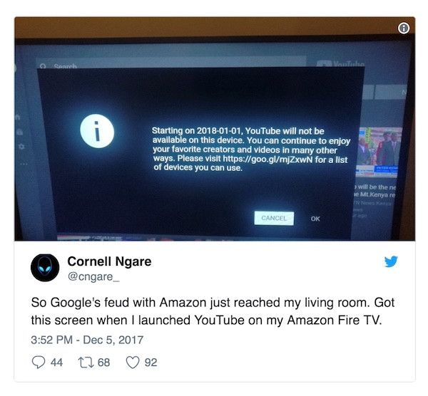 今年早些时候亚马逊收购Whole Foods时,我认为这些实体店所连结的网络将成为品牌和营销人员间的另一个专有接触点。 让亚马逊在martech领域的成为如此强大的垂直竞争对手的不仅仅是这些独有的客户接触点,它还拥有最大的电子商务平台和越来越多的已经开始与Facebook和谷歌竞争的广告平台。 亚马逊作为martech / adtech玩家的最大优势在于他们独特的渠道和接触点以及他们在Amazon.com上所有买家的独家数据。 现在,虽然主流的和专有的客户接口在垂直竞争链中拥有强大的力量,但它们并不一定拥有全部的力量。而那些来自营销者或消费者(该链条的两个端点)的力量,供应商根本不愿意取代或无法取代。 有关这方面的一个例子,我们可以来看这些巨头之间的隔阂:YouTube阻拦了Amazon Fire TV和Echo Show设备;亚马逊拒绝在其商店销售某些Google产品,如Nest Secure,Chromecast,Google Cast ;Google现在禁止许多亚马逊设备访问YouTube。 这是互联网服务(YouTube)和客户端设备(Echo Show)之间强劲的垂直竞争:消费者是否会停止使用YouTube或使用Echo Show以外的其他设备?这取决于他们更看重什么。 进一步说,是品牌更重视什么。
