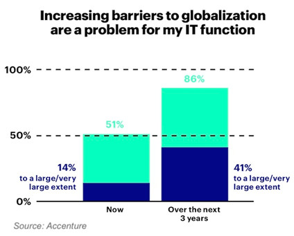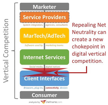 但可以说,至少在美国,2017年有关垂直竞争最大的新闻是美国联邦通信委员会(FCC)废除了网络中立性。 这一措施在突然之间使客户端的连接提供商(AT&T,Comcast,Verizon等)在互联网几乎每一个垂直竞争链上都拥有了巨大的实力。 他们过去拥有相对较小的影响力,基本上与网页浏览器一样商品化。但是现在,他们可以通过限制带宽有效的阻止互联网上的任何站点或服务。 可以说他们现在正扼着数字世界中营销人员和消费者之间的咽喉。 究竟会发生什么还有待观察 - 事实上,相关的法律及立法仍有待观望。但我们有充分理由担心,一旦这项措施得以实施,不仅会影响数字广告和技术,还会影响免费增值和内容营销模式,以及潜在的每一种与消费者直接接触的数字营销工具。 这也证明了政府一旦参与到垂直竞争中,将会带来颠覆性的改变。 我们知道中国有防火墙,欧盟有GDPR(指数据不仅仅是一种资产,而是一种负债),现在美国又废除了网络中立。根据您的服务所在地或您的受众所在地,您可能会受到不同规则的影响,从而导致不同的动态垂直竞争。 埃森哲新的数字分割(digitalfragmentation)报告预警,国家数字壁垒的增长正在使企业的数字环境日益复杂且充斥风险。