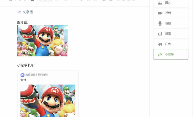 除了单纯的“小程序关联通知”,微信还允许我们在微信推文中,直接插入小程序卡片或链接。只要完成小程序与公众号的关联操作(请见上一步),就可以在文章中插入小程序。 在公众号的文章编辑器里,找到右侧的“多媒体”-“小程序”。点击后,在弹出窗口中选择需要插入到文章中的小程序,进入下一步,填写展示样式(小程序卡片、图片、链接等),以及用户点击后进入的小程序页面参数,保存之后就可以插入到文章中了。