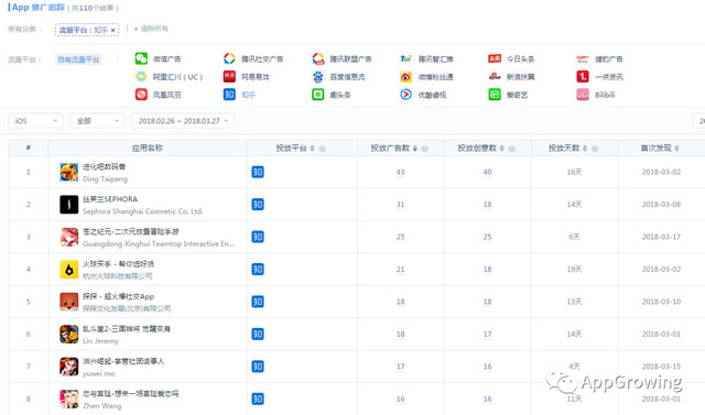 投放素材可按照图片/组图/竖视频/横视频等素材类型进一步细分筛选 二、实时跟踪竞品投放动态 各渠道,跟你竞争的“买量巨头”有哪些?时下热门APP在不同流量平台的投放策略,不同周期内投放广告量的情况,一目了然。 知乎投放渠道风云榜