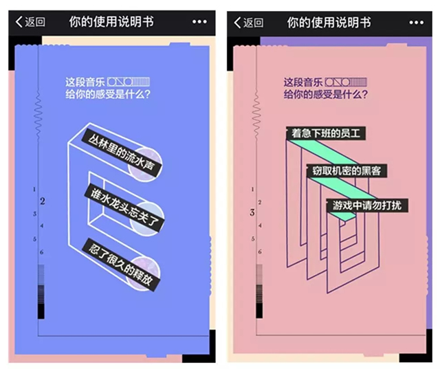 此外,网易云还在最后的结果页上留有自己的小心机,不同于以往的经典红白配色,这次的颜色千奇百怪,每次生成的海报配色不一,有意避免视觉重复感。再加上用户的昵称不仅在主标上以大字体显示,还融入在了描述性文案中被不断提及,有意使参与者产生“为你私人订制”的强烈代入感,从而自发进行分享。 03.发挥自身优势,融合音乐元素 作为音乐应用类营销老司机,网易云可以说充分发挥了自身优势,从包飞机推歌单,到白色情人节的精准推歌,每次都能推出让人眼前一亮的音乐专题,有趣味性的、来波回忆杀的等等,他们对音乐独到的见解总能戳中用户的G点。 但这次的玩法有点不同,网易云将音乐元素放在了游戏过程当中,采用的并非是各种流派的曲子,而是生活中我们比较熟悉的“BGM”。通过播放流水声、打字声、鸟叫声等具有生活气息的声音,让参与者根据直觉去判断自己的感受。