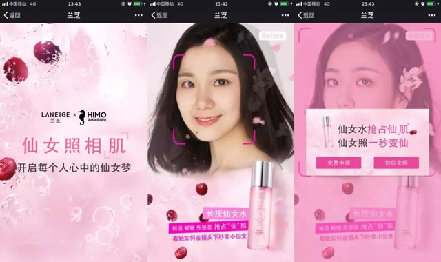 由此不难看出,从颜值到气质,金裕贞的仙女感确实早已深深印在受众脑海里。兰芝邀请代言人小仙女金裕贞为仙女水发声,印证了一个品牌在明星营销方面的智慧。兰芝正是精准找到金裕贞个人品牌形象与仙女调性的契合所在, 借助仙女代言人形象更有利于将仙女水的特点展现得淋漓尽致。并且利用明星代言形成品牌联想, 勾起受众对同款清新活泼小仙女的期待和欲望。 携手海马体照相馆营造仙女仪式感 兰芝深谙拥有仙女状态,不仅仅是保持年轻肌肤来获得仙女美,更需要一种仙女仪式感来将这种仙女生活状态落地。对此,兰芝携手定位“生活需要仪式感”的网红照相馆海马体照相馆,进行跨界合作为女性营造一次专属的仙女仪式感。 围绕仙女仪式感的营销,双方展开系列合作,推出了“每个人心中都有一个仙女梦”主题,通过具象可感知的形式为“仙女”梦想赋予仪式感和体验感。 在前期预热阶段,兰芝邀请ACui阿崔等KOL进行产品体验,巧妙借助KOL生活化的真实测评体验,让产品走进大众视野中,引爆仙女水的关注度。在这个过程不仅仅唤醒了女性的护肤需求,强化了受众对仙女水的认知。这种花式种草和安利无形中塑造了产品口碑,在产品层面成功在“仙女”与“兰芝”建立强关联,将“仙女”的产品概念打进受众的心智。 3月5号仙女照相机正式上线,这是兰芝联合海马体精心打造的仙女主题拍照活动,拍照活动通过设计粉色色调的背景,利用散落的樱花花瓣和发间的羽毛等元素为广大女性拍出仙气满满的照片,营造仙气十足的拍照环境帮女性圆梦。 除了线下的落地活动,兰芝联合海马体推出的“仙女照相肌” H5同步上线,这是集合兰芝51家柜台和45个门店造势,所设计的领取券和体验装的活动。H5巧妙将仙女水卖点“肌肤晶透仙气”与仙女照进行结合,除了派发拍照优惠券,还邀请受众去门店专柜领取仙女水体验装,为线下活动引流。这支H5让大家可以体验到秒变仙女的趣味,成功将“仙女水”抢占“仙”肌的概念再次占领受众心智。