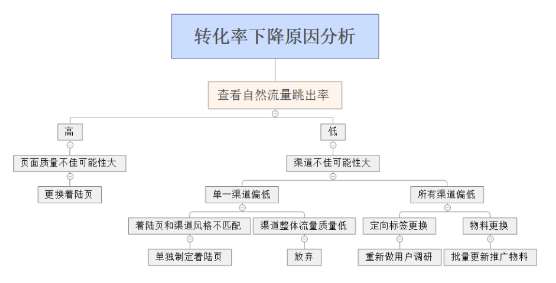 从上图曲线可以看出,2月底转化率开始有明显下滑趋势,我便会根据下面的分析模板去思考,到底是页面转化率降低了,还是整理流量质量开始下降。
