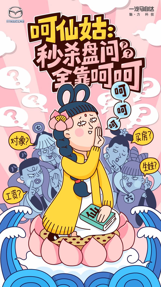 (一汽马自达“拯救春节计划”主海报) 接着机智如我的去顺藤摸瓜,到一汽马自达的官微去看了看,别说,还真挺有意思。中国古代神话里的八仙被重新赋予新“能量”,有点中国版复仇者联盟的意思,海报中的文案变成了急救灵符一般,亲戚围堵?熊孩子爆炸?无聊春晚?被迫相亲?同学聚会?面对春节中的各种“困局”瞬间化解,让小编的心都跟着颤抖了下,大写一个“服”字了得!