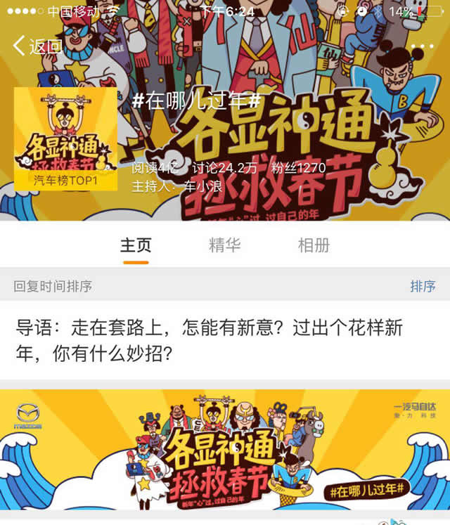 联合明星和知名KOL,话题荣登汽车榜首位 大家都知道,微博乃品牌必争之地,有句话说的好:得热搜者,得天下。流量如此巨大,互动如此密切的战地怎么会少了一汽马自达的身影呢?2月8日,一汽马自达#在哪儿过年#话题高居汽车榜首位,据知情人透露还打破了车企占据汽车榜首位的最长时长记录。 2月13日,该话题再次引发热议,除了多方KOL大号参与外,喜剧明星小沈阳居然也来为话题助阵,#在哪儿过年#话题不仅连续数日雄霸汽车榜榜首,而且在总话题榜上力压#春运2018#、#平昌冬奥会#等热门话题,取得排名第五的骄人成绩。这一波话题运作的成功,其实也反映出了一汽马自达在营销节奏以及节点把控上做的细致。