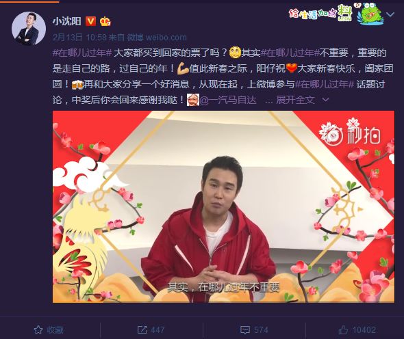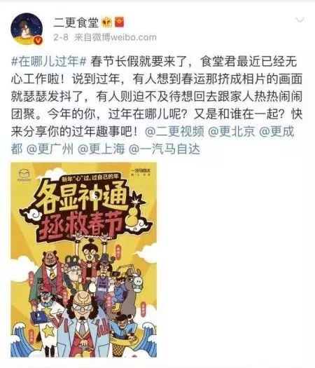 小沈阳参与话题#在哪儿过年# 打造传播矩阵,头部KOL全程配合 KOL,一个2017年最火的营销关键词,能够抓住KOL,其实就等于抓住了用户。与以往传统的合作方式不同,一汽马自达此次选择与头部KOL二更进行合作,借助二更媒体平台的粉丝基础,通过微博微信组合出击,全程配合事件,扩大传播声量。 二更食堂2月5日微信头条《这样套路你的人,一定很爱你》,阅读量40分钟内即突破10万+。2月8日配合#在哪儿过年#话题打榜,二更食堂、二更视频及分站微博参与话题互动,形成一波高效紧密的矩阵传播。