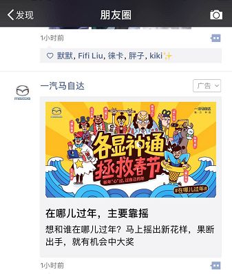 朋友圈H5广告 最重要的是,本次事件形成完整的营销闭环。春节前以用户过年行为路径为参考,借助与携程的合作有效拦截用户,为事件引流;春节中二更等KOL在内容上与春节热点相融合,二更春节主题的原创视频更是推动整个营销事件热度不断提升;春节后以女主人公Lucy春节期间的经历为创意出发点,通过回忆春节期间种种,将情感渲染升华,为事件完美收官;环环相扣的营销动作和节点设置,让本次活动取得了极好的传播效果。 通过“拯救春节计划”的情感营销,一汽马自达不仅打动了受众,与用户建立起深切的情感共鸣,还通过一系列的营销举措为自己带来曝光,并进一步提升了品牌美誉度。这种不走寻常路的营销campaign,既给目标客群营造了新鲜感和品牌好感度,也实现了真正意义上的双赢效果,同时更为以后的春节借势营销提供了一个可供参考的范本。