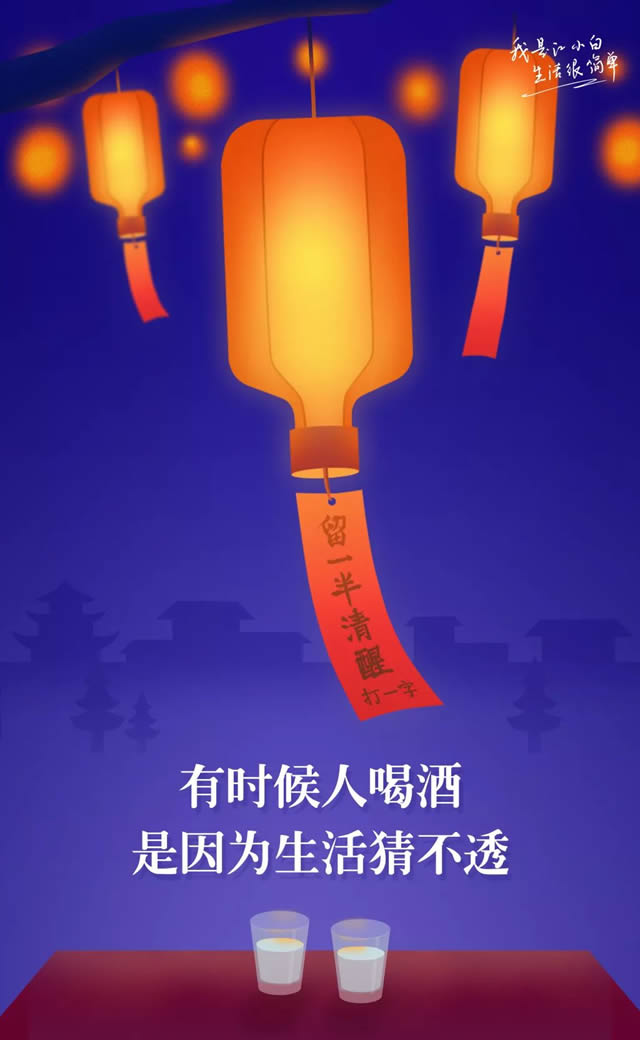 简评:大象这次出了9张灯谜文案海报,精选了两张比较有代表性的,第一张谜底是产品,第二张是品牌名。个人觉得出题水平不如下面的江小白。 江小白 #简单生活# 猜得出灯谜,猜不透情绪。#元宵节#快乐!