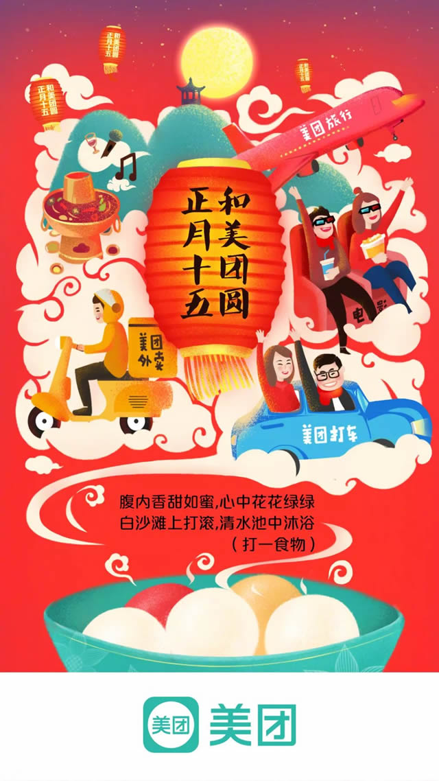 美团 小时候,元宵之后才算过完年,到如今,年中就要离家来上班!美小团知道,是时候关心一下委屈巴巴的你了!→转评本条微博并猜出图中谜底,节后就抽3位粉丝送可爱玩偶/精美手机壳/开瓶器(随机组合2样邮寄)开年福利,快来参与吧!最后祝大家“正月十五,和美团圆”[爱你]#元宵节#快乐! 饿了么网上订餐 #元宵节快乐# 元宵吃汤圆,甜蜜人团圆