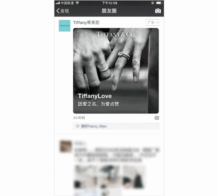 Tiffany:为爱点赞,倾听与分享爱的故事 Tiffany“因爱之名,为爱点赞”的广告主题得到了用户的广泛共鸣,纷纷动手为爱点赞,互动率高于行业均值2倍。点赞翻转后,是Tiffany邀请多对真实情侣拍摄的广告大片,传达品牌信息的同时,也诠释了爱的真谛,吸引众多用户上传甜蜜合影,分享自己的爱情故事,实现了品牌与用户之间的深度互动和连接,更令许多用户在评论里直呼“买买买”。 Tiffany翻转式卡片广告示意