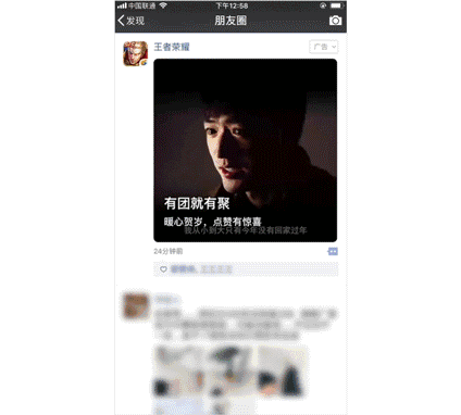 王者荣耀:为团聚点赞,从温情到魔性零距离 王者荣耀关注到那些因各种原因春节不能回家的人们,以“无论距离多远,有团就有聚”为主题,走心内容戳人泪点,然而点赞之后画风突变,背面鬼畜视频介绍游戏新玩法,实力诠释了广告既有温度又具趣味的另一面,正如用户评论:“点赞前的广告很走心,点赞后的广告很魔性”。该广告点赞人数达100万+,可见用户对品牌的认同和喜爱。 王者荣耀翻转式卡片广告示意