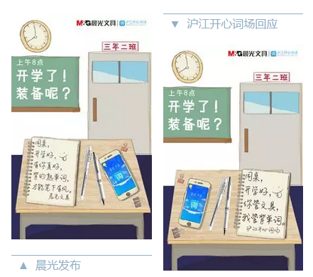 说到借势文案,杜蕾斯绝对算是行业翘楚,去年感恩节一口气调戏13个品牌的场景还历历在目,创意借势和文案的用心令广告界的大拿们都交口称赞。今年开学季,作为一个广告人,小编不禁期待杜蕾斯又有什么搞怪创意,没想到却意外等来了晨光文具的借势广告。 上午8点,学习早读的最佳时间,晨光@沪江开心词场,“同桌,开学好,有你真好,背得熟单词,才能笔下有风。”沪江开心词场回应“同桌,开学好,你管文具,我管背单词。”