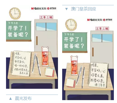 晨光不愧是学霸品牌,即使喝了运动饮料,也不忘书写日月。 下午3点,有些犯困,此时十分需要来一杯好茶醒脑,晨光为你送来澳门皇茶,“同桌,开学好,有你真好,喝一杯好茶,才能妙笔生花。”澳门皇茶回应“同桌,开学好,你管文具,我管好茶。”