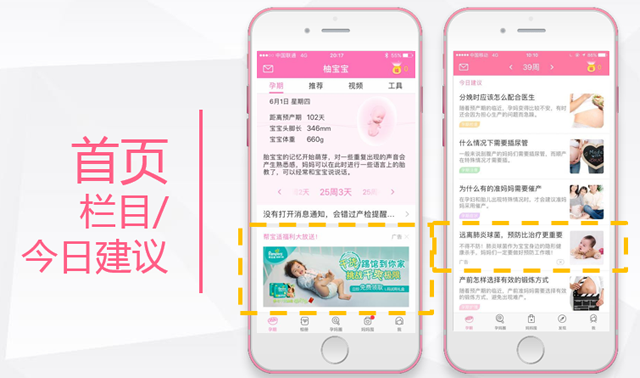 打开柚宝宝APP,一映入眼帘的广告就是开机大图广告了,这里的广告位支持3/5秒的静动态图片,如果广告主选择在这里投放广告可以以醒目的视觉影像,辐射孕期辣妈人群。这里的广告位置很适合母婴、快消、汽车等品牌主强曝光的需求。 2、首页栏目/今日建议
