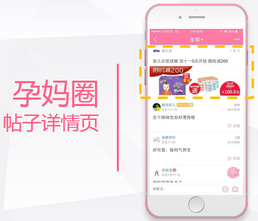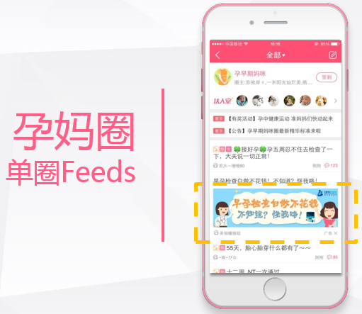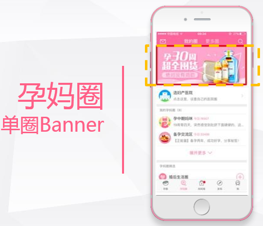 单圈Banner整合营销公司排名支持的广告类型为图片/视频均可,如果广告主选择在这里广告,广告主可以在话题圈制造话题,这样可以直接将广告传递给潜在客户,平台有160个高活跃圈子,这些圈子里涵盖母婴/时尚/健康/家居/快消/金融/汽车等多个领域。 4、孕妈圈单圈信息流