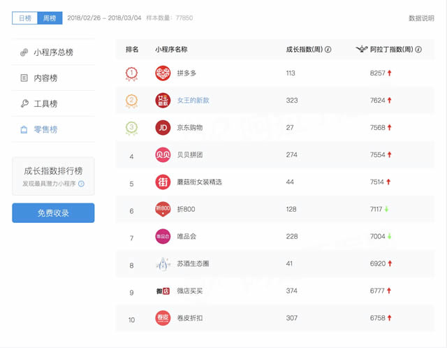 在成立不到两年半的时间里,拼多多已经做到日订单量超过京东,斩获3亿用户量/百万级商家(拼多多官方提供数据),周渗透率超越天猫/苏宁易购/唯品会/京东老四家,成为周活跃渗透率仅次于手机淘宝的电商App。在小程序时代,拼多多更是长期霸占小程序零售榜第一的位置。