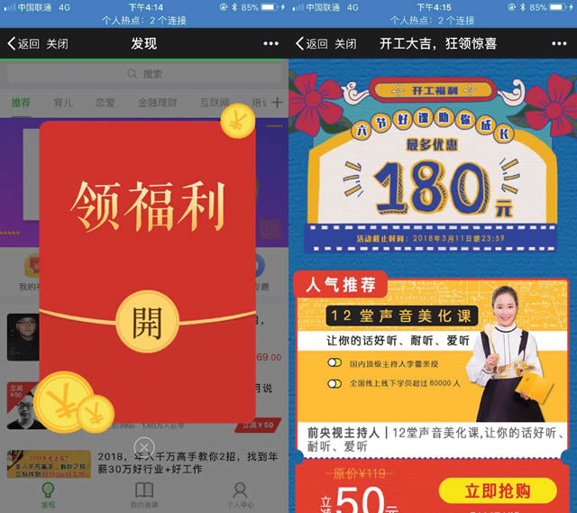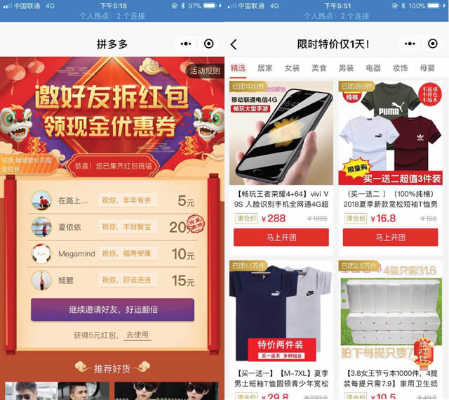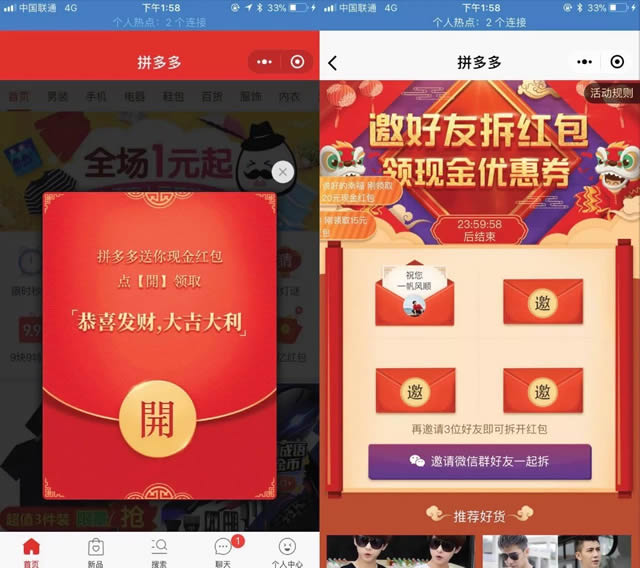 用户进入拼多多小程序后引导红包领取页面及着陆页 只是简单的拼团吗?Nonono,这里面套路可多了: (1)文字优化变“现金优惠券”为“现金”二字第一次加深用户对于红包领取的焦虑:首页写的是“现金”红包,在着陆页左侧展示的其他用户领取的也是“现金”。本质虽然还是优惠券,但是由于文字细节的包装,比常见的商家优惠券更吸引用户点击和分享,有效提高了转化率。 (2)不间断滚动提示其他用户成功领取现金红包第二次加深用户对于红包辽宁广播电台广告领取的焦虑:你看,这么多人都领取了现金红包,不是15元就是20元,心动不心动?心动就赶紧分享啊,拼多多的分享率因此就大大提升了。 (3)落地页醒目位置设置倒计时第三次加深用户焦虑:光前两点不够,拼多多还在页面内设计了红包领取倒计时,晚了你可就领不到红包了,白来的红包呢,怎么能让它“飞了”?赶紧分享!