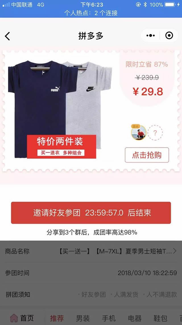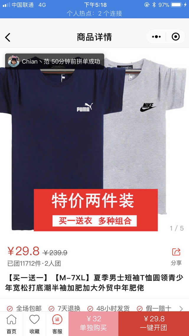 拼多多的产品详情页面大多是产品图片配以大红色的打折信息 于是你就诞生了“担心错过便宜”的焦虑情绪: PUMA/NIKE的短袖,原价239.9现价29.8,1折!跟白送一样!首先从价格上先让用户开始产生焦虑情绪:这么便宜还不快抢!而且还买一送一,这个便宜不占就错过了!不能错过!买!是单独购买还是开团购买呢?开团可以省10%,可是如果开团不成功怎么办?别担心,拼多多再次通过产品细节来打消用户的顾虑。