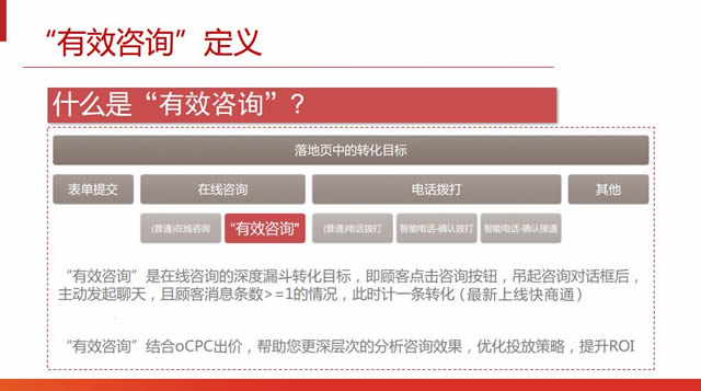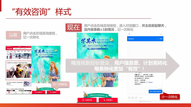 OCPC投放流程 可以说,现在几乎所有的数据收集和分析工作都能由机器完成。依托信息流技术、庞大的用户基数以及丰富的咨询内容,各平台正在不断挑战更高质量的用户触达。 我们知道,很多时候用户在消费的开始是非主动的,从营造消费场景、激发消费欲望到完成支付,为了让整个消费流程变得更加无缝便捷,形成营销闭环,广告主和平台需要做出进一步动作激发潜在消费者的购买欲望,刺激购买行为。这个时候,可以接入一套IM工具及时提供沟通咨询服务。 比如今日头条接入了快商通、美洽、53kf,手机百度也接入了快商通。将IM工具与其他数据管理工具结合,今日头条去年上线“有效咨询”功能,用户主动发起咨询的意愿更强,线上沟通更及时高效,有助于整体提升深层转化。