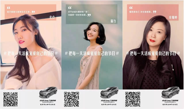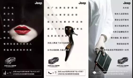 这6张海报,是Jeep三八节围绕“把每一天活成宠爱自己的节日”而做的一波social传播,邀请庄雅婷、颜如晶、小江的时间缝隙、六六、猫力、余点6位不同年龄层、不同领域的女性KOL,通过自己的故事解读女性如何宠爱自己。6位KOL的社交媒体推文在3.8这一天集中发出,一举赢得数以百万计的女性受众的关注和共鸣。 Jeep为何偏爱“她”? 爱自己、宠自己、为自己,越来越多的女人,在悄悄改变着,作为品牌,焉能不变?女性逐渐在母亲、女儿、妻子、主妇等角色之外,为自己留出了越来越多的时间和空间。专属于女性的“妇女节”,也苏州营销推广顺势演变为“女生节”、“女神节”、“女王节”,女子力影响日增,直接带动了“她经济”的增长。有数据显示,到2019年,中国内地女性经济市场规模有望达到4.5万亿元。“她经济”下的消费行为趋势具体表现为以下五个方面: 情感化:消费需求不再出于生活必需,更加偏向于满足情感上的需求,或者追求产品与自我的契合和共鸣。 多样化:现代女性不再满足于一成不变的生活、千篇一律的形象,她们乐于尝试不同的生活方式,重在体验。 个性化:越来越多的女性开始追求与众不同的产品或服务。 自主化:女性消费者自主消费意识进一步增强,购房、购车群体中女性占比逐步增加。 休闲化:休闲不仅是现代消费的一大特点,而且是“她经济”下主要的消费趋势。 由此可见,女性不断增长的消费需求和旺盛的消费能力,对于品牌方而言,是机遇,更是转变营销和传播思路的时机和信号。因为,女性的消费和心理需求有其独特之处,粗放式的营销很难满足她们对产品和服务的期待。Jeep显然是敏锐地洞察到了这一点。 到“她”在的地方去! 面对潜力无限的“女王”群体,Jeep看准“女王节”这个宝贵的时机,开创性地进行了一波霸气且走心的营销。 结合此次营销主推的车型——大指挥官的品牌诉求和产品特性,Jeep的“女王节”营销活动的基调是“宠爱自己”。在品牌官方微信号上,以3幅抢眼的海报,借助女性大爱的口红、鞋子、书籍,迅速抓住女性受众的眼球,传达鲜明的“宠爱”主张,引起女性消费者的共鸣,并抛出悬念:“全新Jeep大指挥官能装下多少支口红/多少双鞋/多少本书?”同时引出了“女王节”当天的营销活动高峰时刻——于杭州西湖银泰举办的线下互动活动。
