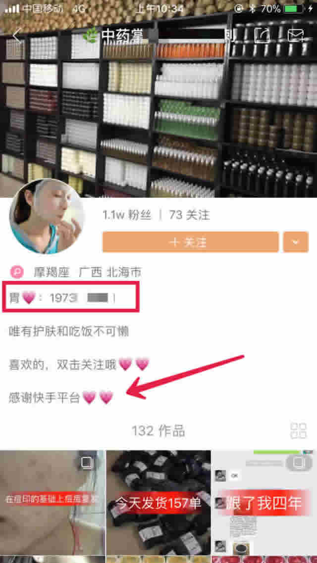 然后再返回去,继续点开第三个作品,这时候不用点赞也不用转发,我们直接来评论一下别人的作品,随便留下一句话就行,比如你可以写老铁没毛病666之类的。 最后一步,来到同城这里,随便进入一个直播间,最好选人数多一些的,然后认真看一会直播,如果不想看可以挂上半小时,偶尔发言一句,比如说你好帅呀之类的。 这是模拟正常用户的一些基本操作,这几个步骤一定要做,养号期间千万不要着急做广告,先这样安安分分的玩几天,每个短视频平台操作都差不多,按照我说的技巧去养号即可。 第3步,打造个人IP形象 养号一段时间后,我们可以开始打造个人IP形象了,这时候需要把资料全部修改一遍,其中昵称和个人介绍是关键,昵称可以根据你自己的产品,取一个痛点名称就行了,比如你是卖减肥产品的,那可以写“中药健康调理肥胖问题”,或是写“瘦身纤体我最拿手”之类的。 昵称一定要打广告,否则后期的直播发言+评论别人的作品这两步没法玩。 个人介绍这里可以围绕你的产品或专业写一两句介绍,重点是一定要留下你的联系方式,并且不要直接写微信或V信,这种常规的已经被玩烂了,所以和谐几率很大,建议写成胃心型,也就是下图主页中的那种效果,结尾最好再加一句:感谢快手平台之类的。