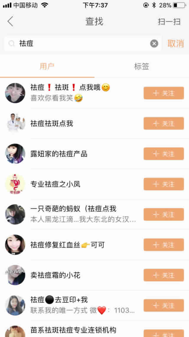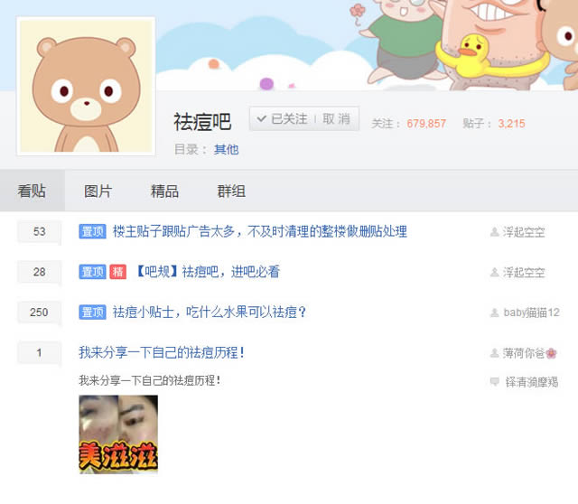 第二个渠道是兴趣部落,这个跟百度贴吧差不多,虽然流量没那么大,但是素材可不少,也是可以根据你的产品去找到很多相关的精准部落,比如我搜索祛痘,就可以在祛痘部落里面找到很多这种前后效果对比图,全部搜集下来即可。