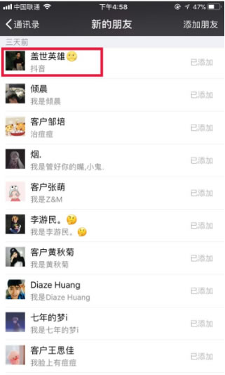 既然每个作品的播放量都有一千几百,那每天有多少精准流量加微信呢?在这里我也给大家晒个微信这几天来粉的真实数据,毕竟还是那句话,大家都是成年人,凡事讲究证据,这个打造个人IP形象的精准引流玩法到底有没有效果,一切用数据说话。 大家注意看,有的客户加我的时候备注了美拍或抖音,这个就说明绝对是从我美拍或抖音过来的,这点毋庸置疑,但其实大部分客户添加我们的时候都是不备注的。对了,大家发现没有,有的客户我们已经帮他改备注为客户XXX了,或是直接改成了客户的真实姓名,这种就说明他已经被我们成交过的了。