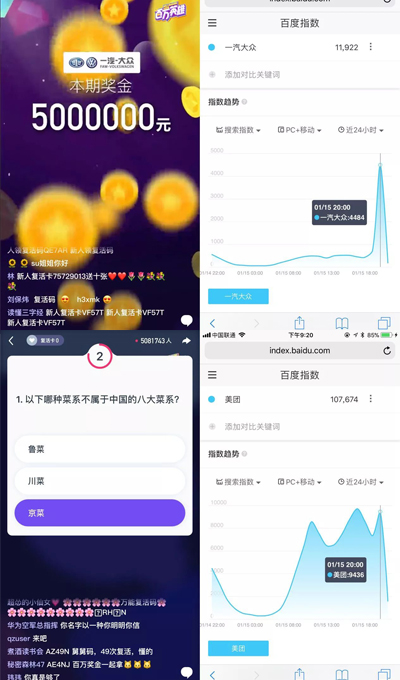 美团微头条与美团App互动预热 本场节目在线人数达到迄今为止历史最峰——510万,露出品牌的24小时搜索指数均显著上涨。第4题“以下哪款产品是肯德基早餐不提供的”,让“肯德基早餐”的搜索指数由41猛增至5933;终极一问前出现的“苏宁易购”,搜索指数从300多升至15000多,以原生视频亮相的“易烊千玺”,搜索指数更是从2000多上涨至20000多,狂飙10倍。 下面是广告狂人专场对露出品牌的搜索指数影响,你们感受一下:
