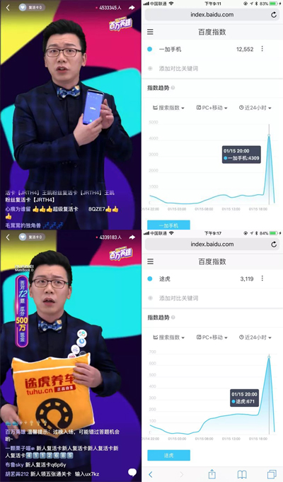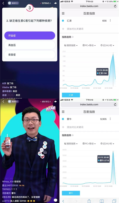 2.花式互动:仅仅展示当然不够,百万英雄想品牌所想,为品牌定制了花式权益。开场前主持人陈铭拿着一加手机向大家透露在微头条互动可以赢得大礼,一加手机赚足眼球;他在直播中途看似随意的喝了几口蒙牛“zuo酸奶”,为这个“辣味”酸奶送上一波好安利,1分钟内让“蒙牛”的搜索指数从416上涨至5666。