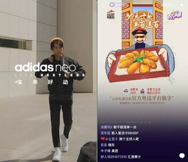3.原生视频:在直播开始前的页面,阿里钉钉、金纺、58同城、苏宁易购、电影唐人街探案2的视频广告滚动播出,在等待开始的黄金时间,既可为等待开场增添乐趣,不破坏用户体验,又可实现品牌信息充分生动的表达,可谓一举多得。 原生竖屏视频也是一大创新看点。第3题“必胜宅急送的外送食品为何到手还是烫的”之后,必胜客宅急送的竖屏视频宣传了“外送独享活动礼遇”;在第8题之后adidas neo的竖版视频全屏播出,其“生来好动”的青春态度得到生动展现,品牌搜索指数也随之高涨。