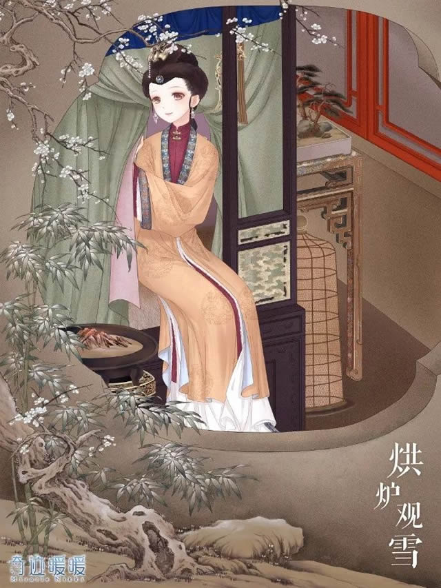 回看亭亭雪映窗,淡淡烟垂岫。佳人如玉,烘炉观雪。(服装元素来源于“胤禛美人图”)