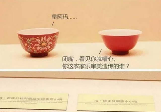 故宫博物院x央视: 国家宝藏 一直以来,乾隆皇帝的农家乐审美广受网友吐槽,而这吐槽其实源于一张对比图——一只雍正朝的小碗和一只乾隆朝的小碗被摆到了一起。但随着《国家宝藏》的热播,乾隆“农家乐审美”的帽子似乎越戴越稳了。