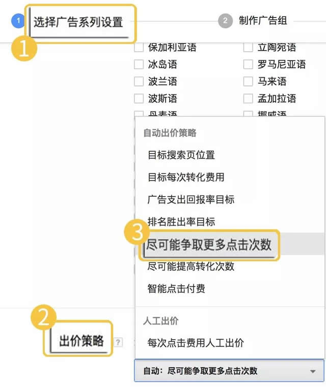 适用广告 搜索广告、展示广告和购物广告 Google 小贴士: 什么是转化?用户在网站上完成一次我们设定好的目标行为就可以算一次转化,比如注册、提交询盘、顾客将商品加入购物车,还有下单购买,广告取得了你想要的效果,就是转化。 10分钟成为出价小高手 从刚开始使用Google,到有一定数据积累,不同阶段你需要不同的出价策略。 第一阶段:新手要争取最多数据 如果你是才开始使用Google的新用户,请选择“尽可能争取更多点击次数”的自动出价。 原因 刚开始使用Google,还没有客户数据,无法准确判断客户喜好。因此这个阶段你要先让有用的点击增多,测试是不是投对了地方、客户的喜好,这些数据对你至关重要。“尽可能争取更多点击次数”出价策略,可以帮助你在最短的时间内获得最多的数据,这些数据怎么用,下文会讲到。 方法 进入AdWords账户>选择广告系列设置>出价策略>尽可能争取更多点击次数