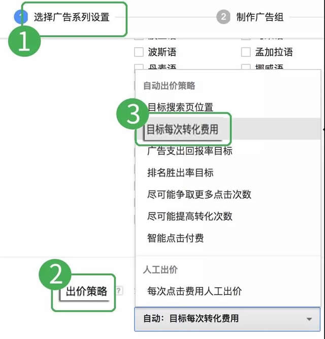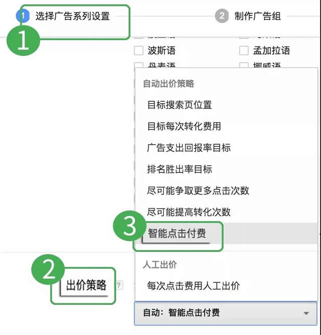 第二阶段:人工出价获得优质流量 使用以上出价策略运行广告一两个星期,拥有一定数据后,它的历史使命就完成了,你需要立刻转变自己的出价策略,大部分用户也都会处于这个阶段——运行了一段时间广告,客户也点击和浏览了,但这个时候客户转化的数据还不够,此时,请选择“每次点击费用人工出价”。 原因 当你从第一阶段获取更多点击后,通过积累的数据你了解哪些展示位置更好,哪些创意更好,比如某几个关键词汇带来更多流量,那就应该加多投入;哪些词带来了无关的流量,就应该增加否定关键词,让流量更准确。这个出价策略给你百分之百的控制权,并且能吸引到高质量的流量。转变成人工出价,让你的每一分钱都用在刀刃上。 方法 进入AdWords账户>选择广告系列设置>出价策略>每次点击费用人工出价 那么,到底该为每个关键词,每个广告系列设置多少价格为好?我们建议你根据之前自动出价的情况,做出判断和调整。把之前同样的预算放在效果更好的关键字或广告上,然后随时监控结果。 人工出价不一定是最佳做法,但是在没有足够转化数据之前,一定是最稳妥的做法。 第三阶段:智能出价成为转化高手 当某一个广告系列每个月的转化达在30个到50个之间时,就又到了调整出价策略的时间了,你需要选择“智能出价”来进一步提高转化率,剩下的事就交给Google,它会全力以赴帮你争取更多转化。 原因 在获得30个转化之后,你已经积累了足够的客户数据、广告效果数据和转化数据,此时Google可以帮你从复杂的数据和效果背后,分析出客户倾向和爱好,然后运用智能出价帮你找到更多类似的客户,促成转化。 方法 进入AdWords账户>选择广告系列设置>出价策略>智能点击付费