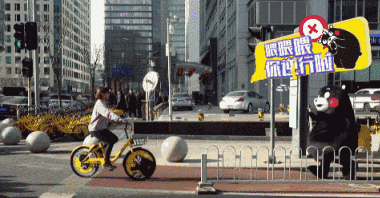 这些无意识的行为,看起来很小,但很容易就会酿成交通事故。于是,ofo请来熊本熊,化身为街头“交通安全大使”,制止了一幕幕不按交通规则骑行的行为。 试想一下,如果你在街头,看到一只熊本熊,像个志愿者一样在提醒骑行的人注意交通规则,应该会被逗乐吧?