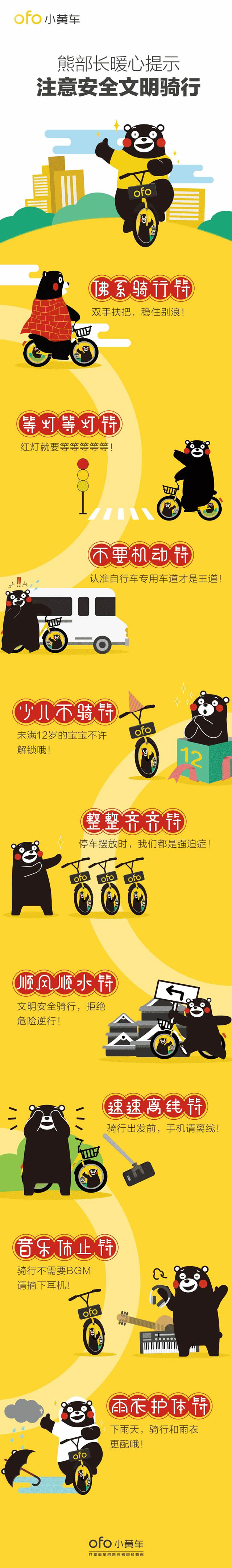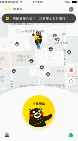 相信很多人打开ofo的App那一刻,估计内心都会被萌化吧。从而也会顺其自然,看完熊本熊给到的安全文明骑行提示。 根据相关资料显示,ofo和熊本熊的这次联名互撩,也是熊本熊在今年1月8日放宽海外品牌授权使用限制后的首批合作。对熊本熊来说,搭载ofo这样已经积累了海量用户的品牌,以这样的方式完成一次合作,无疑会在它原本贱萌的形象基础上,添上一份有趣的“正义感”。对ofo来说,在自己探索和IP跨界合作的路径上,又往前走了一步。因为在这之前,无论是和小黄人的跨界,还是和皮卡丘的合作,都更多的是集中在定制车辆上面。