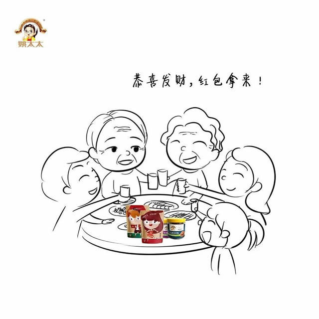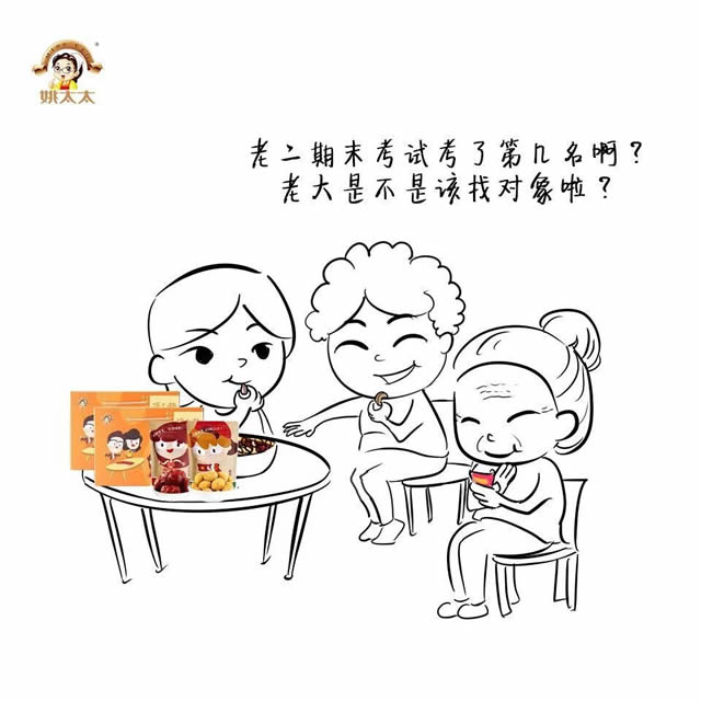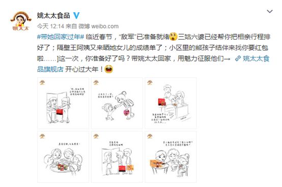 诸如此类的尴尬事在过年期间是数不胜数,每个人都会遇到自己的尴尬。怎么破?办法就是带心爱的她——姚太太回家。试想我们过年回去带着姚太太鸿福大礼包,走亲访友送个姚太太,既有面子又实用,遇到亲戚朋友盘问的时候直接递上一包姚太太,完美岔开话题;面临邻居不停地炫耀自己的孩子的时候递上姚太太,在吃零食的同时结束话题。 最为重要的,我们千万不能忘了我们的父母,同样一个姚太太鸿富大礼包带给父母,再有小孩上门讨红包,直接一包姚太太,小孩大人都开心!别忘了,我们都说老小孩,父母也是喜欢吃零食的哦!除夕夜守岁时,一家老小欢聚一堂,边看电视、边吃零食、边聊天,这种其乐融融还有什么能够代替呢?这就是今年的姚太太食品的微博广告。