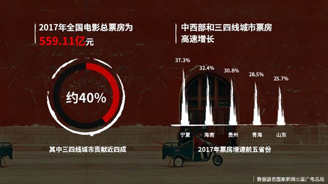 几十年前的“上山下乡”把当时的文化产品,尤其是电影,渗透到了中国的每一个城镇、每一个乡村,那个时候的文化渗透率很高,虽然相对内容比较单调一些。但是今天,新的文化内容通过互联网的渠道和一些线下的渠道,在向更深、更广的地方进行渗透。从数字上讲,2017年全国电影的总票房559亿,有40%是来自三、四线城市的。中西部的这些城市和三、四线城市电影票房的增长速度是远高于一线城市的,这是新的渠道。