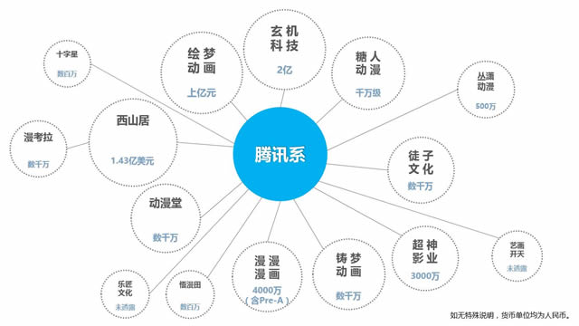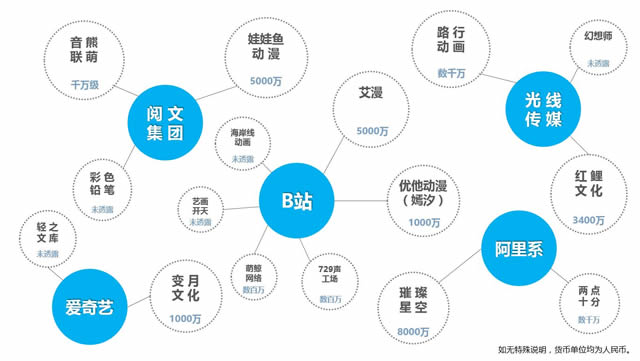 具有平台资源的机构背后的投资逻辑显而易见:内容是平台的流量入口,资本对二次元文化的追逐背后,是大量互联网公司开始享受二次元人群的人口红利,而新兴的二次元文化内容构筑了当下难得的流量增量市场。随着BAT对泛娱乐行业的布局步入整合突破期,垄断形势渐显,而竞争也将更加激烈。为了建立各自的流量护城河,平台不会停止对产能与内容的争夺和深度绑定。 腾讯在2015年首提“二次元经济”概念,一直以先行者的姿态领跑行业。2017年,不计算阅文集团的投资项目,腾讯系投资的二次元公司也多达14家,在数量上遥遥领先于其他投资机构。 B站在2017年设立了国创专区,国产动画在B站的重要性不言而喻。但与其他视频内容平台不同的是,由于B站承诺不加贴片广告,流量变现除了站内广告,主要被导流至游戏、衍生品电商、票务平台等其他业务。除了动画和漫画公司,B站的投资列表中,还可以看到衍生品电商、虚拟偶像、声优、二次元游戏等各细分领域的企业。目前B站总共已经投资了超过40家二次元行业上下游公司,正在构筑一个更为核心的二次元生态。