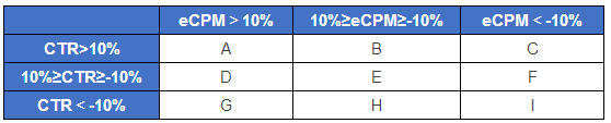 广告投放数据运用:利用广告投放数据,计算该广告创意的平均CTR、平均eCPC和平均eCPM三个指标。如果平均eCPC接近CPC出价,建议对CTR进行优化,保持CPC出价;如果平均eCPC低于CPC出价较多,且平均eCPM高于行业均值,那么可以适度下调CPC出价。 广告人群数据运用:对于广告的小时报表、地域报表、年龄报表和其他人群画像报表,计算这些人群报表的不同维度的广告创意的平均CTR、平均eCPC和平均eCPM三个指标。 设定阈值具体的指标(例如:高于平均值10%,在平均值正负10%之间,低于平均值10%),可以根据实际的投放情况和KPI来进行设定。将CTR和eCPM两个指标对应的阈值区的数据选取出来,你将会得到一个9个方向的人群类型: