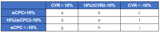 广告投放数据运用:利用广告投放数据,计算该广告创意的平均eCPC、平均CPA和平均CVR。如果平均CPA高于目标CPA,且eCPC接近CPC出价,则可以利用此法优化定向,降低成本。 广告人群数据运用:对于广告的小时报表、地域报表、年龄报表和其他人群画像报表,计算不同维度广告创意的平均CPA、平均eCPC和平均CVR三个指标。 设定阈值具体的指标(例如:高于平均值10%,在平均值正负10%之间,低于平均值10%),可以根据实际的投放情况和KPI来进行设定。将eCPC和CVR两个指标对应的阈值区的数据选取出来,你将会得到一个9个方向的人群类型: