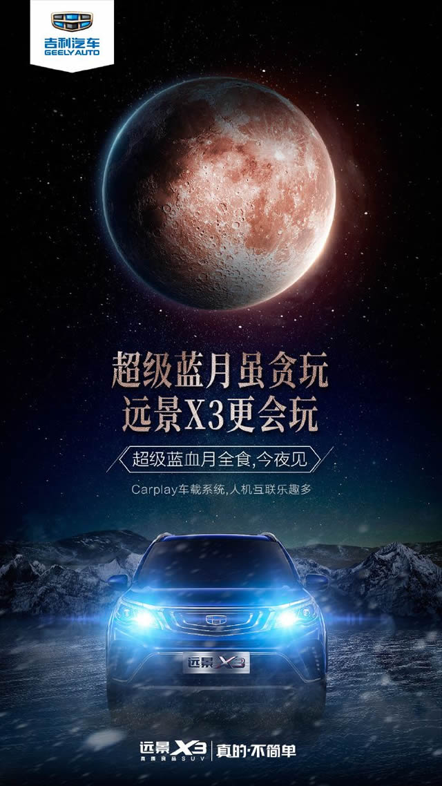吉利汽车:时隔152年再遇蓝血月19:48-23:12,远景X3陪你一起贪玩蓝月[笑而不语]