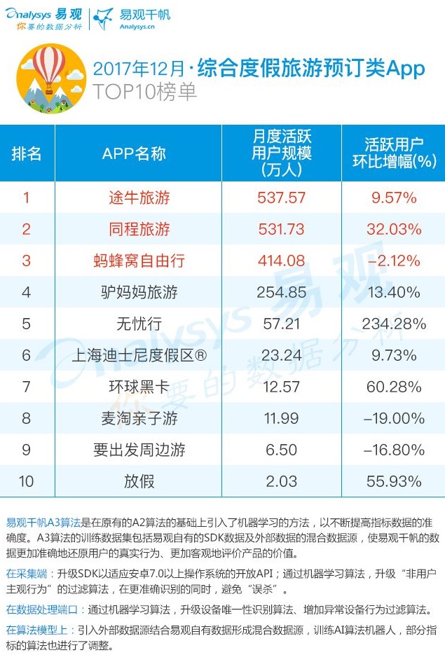 根据易观千帆12月监测数据,综合度假旅游预订类AppTOP10中,领域集中度仍然极高,头部4个厂商的活跃用户占比达93%。其中,途牛以537.57万活跃用户继续排名第一;同程经历了与艺龙的合并后,会员体系的打通激发出环比32.03%的增幅而爬升到第二位;蚂蜂窝和驴妈妈紧随其后,蚂蜂窝受季节性波动影响环比略有回落,而驴妈妈仍然增长势头迅猛,获得13.30%的增幅。 榜单中,前四位之后则属于尾部厂商,活跃用户数在60万以下,与头部厂商差距十分明显。但无忧行环比增幅234.28%让人印象深刻,这主要归功于其用户基数较小和产品特性。该产品是中移动出品的出境旅游流量预订产品,其在12月的爆发说明了用户的互联网使用习惯已蔓延至出境旅游。 2017年12月综合度假旅游预订类TOP10榜单