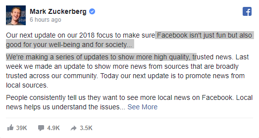 Facebook 信息流将优先展示本地新闻 继 Facebook 宣布将不再优先展示信息流中媒体发布内容后(→ 相关阅读),近日,该公司继续宣布将在信息流中优先展示特定类型的新闻:第一类是“可靠”媒体发布的新闻;另一类是本地新闻。 Facebook 周一宣布,将在信息流中优先推送本地媒体发布的新闻,并在测试一个新版块作为发布本地新闻/活动的专用页。此项功能调整将率先在美国地区实行,并计划今年晚些时候扩展至其他国家。