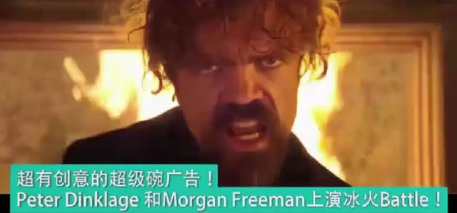 在短短30秒的时间里百事再现了曾经出现在百事广告中许多经典的面孔,如迈克尔·杰克逊、布兰妮·斯皮尔斯、传奇车手Jeff Gordon、Uncle Drew、甚至还有经典电影《回到未来》里的DeLorean跑车。果然,这波回忆杀也是让很多的网友彻底沸腾了,许多网友纷纷在YouTube疯狂打call。还有网友非常感性的说:“非常感谢百事可乐记住流行音乐之王迈克尔杰克逊!” 最劲爆的广告 今年多力多滋(Doritos)带来的超级碗广告相当劲爆,联合激浪饮料,找到权力游戏“小恶魔”提利昂扮演者Peter Dinklage以及“上帝”摩根弗里曼,小恶魔吃的多力多滋代表了火,摩根弗里曼喝的激浪饮料代表了冰,两人爆发一场逆天的冰火Rap battle。 据专业翻译出rap中的广告语分别是“多力多滋Blaze,一个大胆新味道带来热浪”和“激浪汽水,清爽的柠檬饮料”。很好的契合了各自产品的调性,让冰火两重天相互碰撞带来的一定是最劲爆的化学反应。尽管广告片中两人的说唱只是对口型,但气场压制了一切。管它是不是真的呢。只能说多力多滋与百事的这波跨界营销,不得不服!