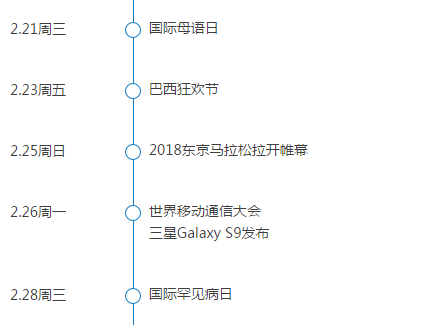 2018东京马拉松拉开帷幕 热点日期:2月25日 热点范围:体育用品、健身行业、户外运动产品 关键词:健康、体育、健身、积极、生活 热点追法: 1、心里暗示法 以运动员健美的身材,挥洒的汗水作为海报,增加运动对消费者的吸引力,暗示消费者从现在开始减少高热量食品市场舆情的摄入,增加运动量,提醒消费者“运动员的身材就是就是选择运动后的你”。最后加上产品,让消费者相信,选择好的产品可可以帮你在锻炼的道路上事半功倍。 2、周边服务保障法 刺激是现在人追求的一种生活方式,票务、酒店、机票预订可以推出优惠,鼓励大胆自由的年轻人去尝试户外运动,然后植入自己的产品,表达出在追求大胆自由的生活方式时有一份周边服务保障相伴而行。 世界移动通信大会和三星Galaxy S9发布 热点日期:2月26日 热点范围:手机行业、电商平台 关键词:新款、全面屏、智能升级 热点追法: 技术保障,产品优质,配件全面。借着世界移动通信大会,各手机生产商可以显示自己人才济济,有优秀的研发平台,保障了产品的质量,为自己的品牌打Call;电商平台可以紧跟热点,相应的推出最新款的手机以及相应的配件,方便以及促进消费者的购买,促使交易。 2月份的热点已经帮你梳理完毕了,快快收藏吧!
