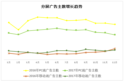 分屏数据概览:双端投放表现稳定差距逐渐收窄,移动端的受关注度还在持续上升 分屏格局显示,网络的展示类广告在PC端的投入有所回暖,11月和12月的PC端预估费用分别为29.6和31.5亿元, 但与16年相比,两个月份的费用的同比下降仍然在10%左右。移动端方面,两月均有较为明显的增加,11月增加4.2%,12月继续上涨6.3%,移动端两月的投放费用分别为11.9亿和12.7亿元。 在广告主数量方面,PC端11月广告主数量为4059个,12月的趋势和16年同期保持同步,下降明显,环比降幅为7.8%,广告主数量为3743个。移动端在11下降8.0%,广告主数量共计1327个,但12月上升非常明显,较11月增长10.4%,达1465个广告主。目前看来,广告主对移动端的关注度还在持续上升中。